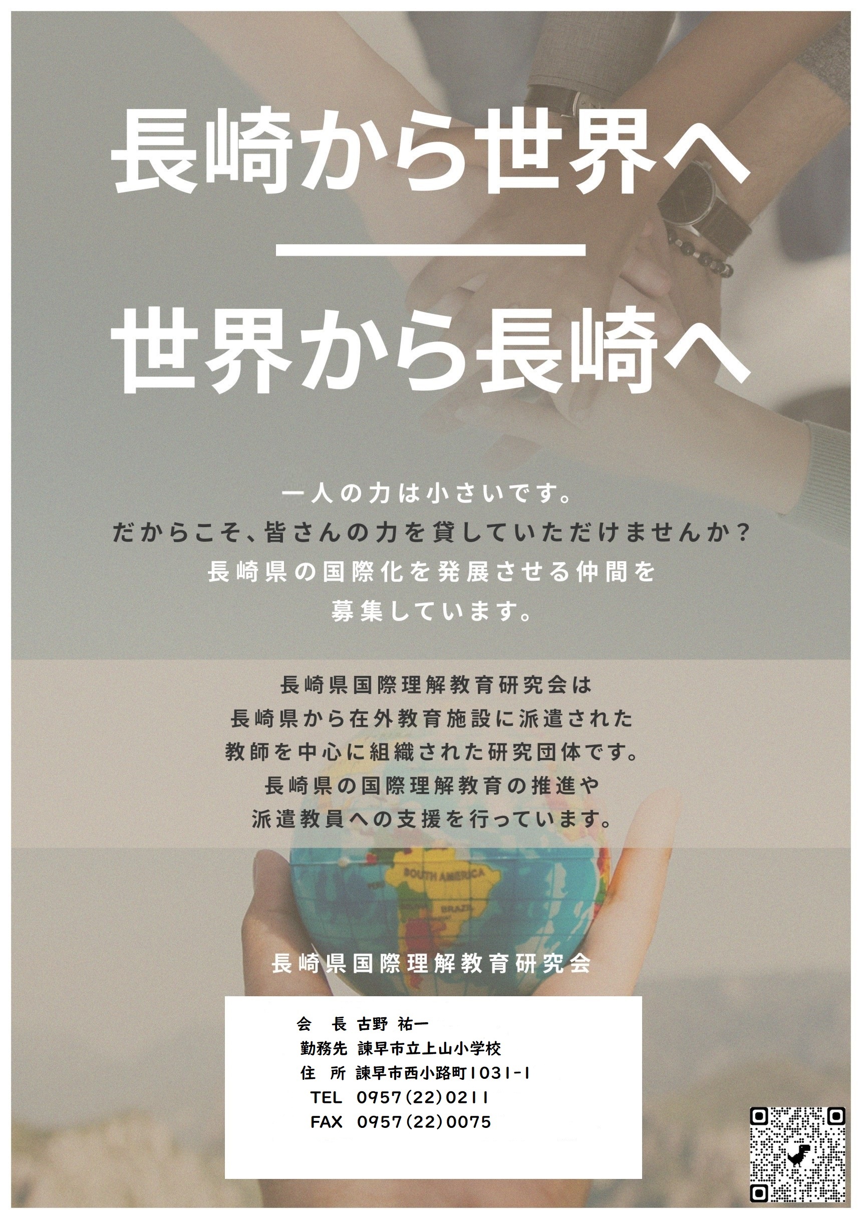 この会は,国際理解教育の充実・発展に寄与すること,ならびに海外子女教育及び帰国子女教育・外国人子女教育の普及と振興を目的として活動している教育団体です。本会は,在外教育施設(海外日本人学校等)派遣教員経験者を中心に組織され,本県国際理解教育の研究と振興,並びに在外教育施設派遣に関する情報収集と派遣教員に対する支援などを目指し,活動を続けております。 総合的な学習の時間での国際理解教育や外国語,外国語活動に興味のある方,あるいは実践されている方,また,在外教育施設への派遣を希望されている方等,是非,本研究会にご参加いただき,国際理解教育や外国語活動のあり方について,一緒に考えてみませんか。